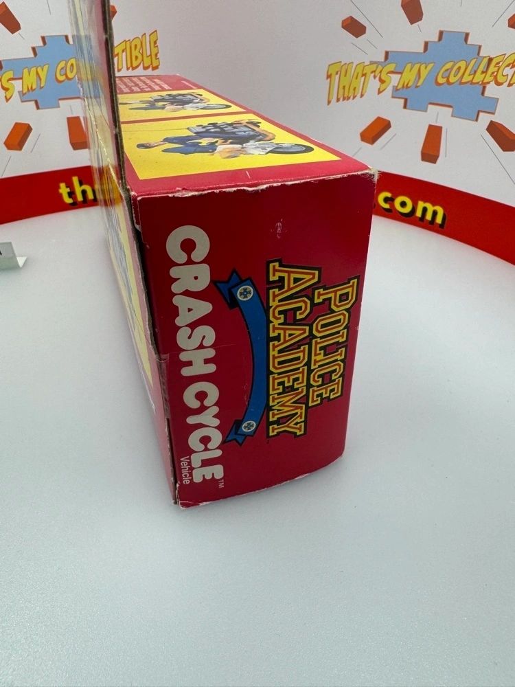 Police Academy Crash Cycle Item is in box with inserts and instruction. Box has wear and veining in spots as shown in photos. 1989